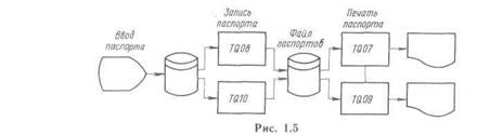 Для работы с паспортами предназначена подсистема Вопросник, состоящая из четырех программ. Структура Вопросника показана на рис. 1.5. Паспорт состоит из двух частей − характеристик оборудования и таблиц. Каждая часть паспорта обрабатывается двумя программами: одна предназначена для записи паспорта (TQ08 и TQ10), другая − для его распечатки (TQ07 и TQ09). Вопросник читает исходный текст паспорта и проверяет форматы и значения данных. После перекодировки паспорт в двоичном формате записывается в файл паспортов, который используется при прогоне постпроцессоров.