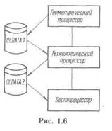 Процессор формирует файл CLDATA1 , в котором содержатся геометрические и технологические данные. Технологические операторы обрабатываются процессором так же, как и операторы постпроцессора: процессор заменяет служебные слова их внутренними кодами и вычисляет арифметические выражения. Расширенный файл CLDATA1 обрабатывается технологическим процессором, на выходе которого формируется файл CLDATA2, содержащий траекторию движения инструмента и операторы постпроцессора.