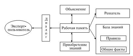 Типичная ЭС состоит из следующих основных компонентов: решателя (интерпретатора), рабочей памяти (РП), называемой также базой данных (БД), базы знаний (БЗ), компонентов приобретения знаний, объяснительного и диалогового компонентов (рис. 5.1).
