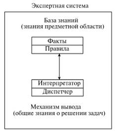 База знаний ЭС содержит факты (данные) и правила (или другие представления знаний), использующие эти факты как основу для принятия решений. Механизм вывода содержит интерпретатор, определяющий, каким образом применять правила для вывода новых знаний, и диспетчер, устанавливающий порядок применения этих правил. Такая структура экспертной системы показана на рис. 5.4.