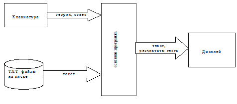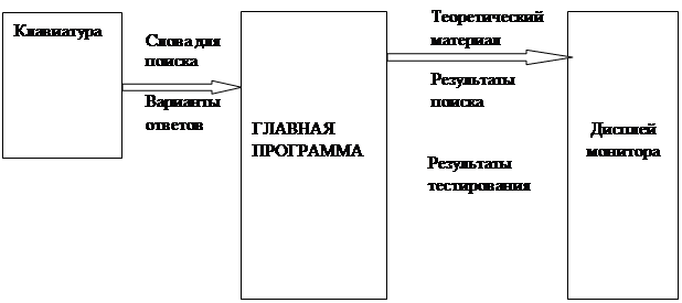 Существует главная программа. В неё поступают Входные данные, вводимые пользователем с клавиатуры (варианты ответов в тесте и слова для поиска), а также из внешних текстовых файлов (теория о ПДД). В ответ на вводимые данные главная программа выводит на экран монитора Выходные данные – теоретический материал, справку, результаты поиска и тестирования. Схематически работа программы изображена на рисунке 1.6.