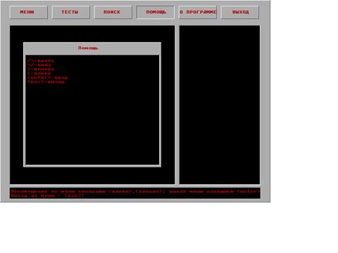 Работа программы начинается с загрузки главного меню программы. Он состоит из строки меню, статусной строки, двух окон вывода. Строка меню состоит из шести пунктов. Пользователь выбирает нужный ему пункт меню. Назначение пунктов строки меню следующее: