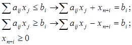 Первым делом необходимо получить каноническую задачу. Преобразование общей и стандартной ЗЛП производится на основе свойств эквивалентности этих задач. При этом неравенство преобразуется в равенство путем введения дополнительной неотрицательной переменной. В результате система ограничений будет записана в виде системы линейных уравнений, где количество неизвестных больше, чем количество уравнений.