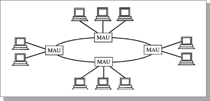 Сеть Token-Ring имеет топологию кольцо, хотя внешне она больше напоминает звезду. Это связано с тем, что отдельные абоненты (компьютеры) присоединяются к сети не напрямую, а через специальные концентраторы или многостанционные устройства доступа (MSAU или MAU – Multistation Access Unit). Физически сеть образует звездно-кольцевую топологию. В действительности же абоненты объединяются все-таки в кольцо, то есть каждый из них передает информацию одному соседнему абоненту, а принимает информацию от другого.