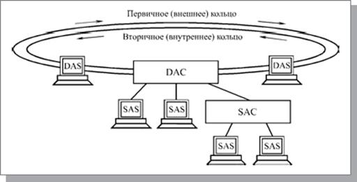 - Абоненты (станции) класса А (абоненты двойного подключения, DAS – Dual-Attachment Stations) подключаются к обоим (внутреннему и внешнему) кольцам сети. При этом реализуется возможность обмена со скоростью до 200 Мбит/с или резервирования кабеля сети (при повреждении основного кабеля используется резервный). Аппаратура этого класса применяется в самых критичных с точки зрения быстродействия частях сети.