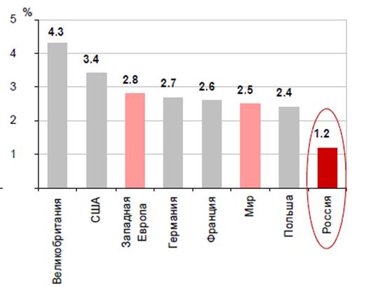 Рис. Объем рынка ИТ в % от ВВП в различных странах [29]