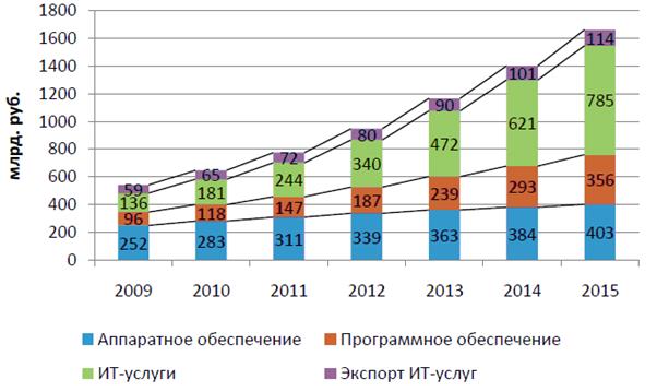 Рис. Прогноз развития российского ИТ-рынка 2010-2015 год, млрд.рублей[30]
