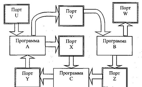 Пример программной системы с портами сообщений приведен на рис. 6.3. Порт Uможет рассматриваться как порт вводных сообщений для представленного на этом рисунке коллектива параллельно действующих программ, а порт W - как порт выводных сообщений для этого коллектива программ.