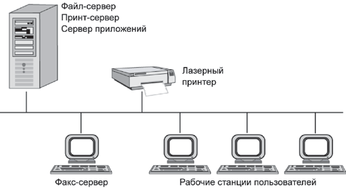Главной целью сети отдела является разделение локальных ресурсов , таких как приложения, данные, лазерные принтеры и модемы. Обычно сети отделов имеют один или два файловых сервера, не более тридцати пользователей (рис. 1) и не разделяются на подсети. В этих сетях локализуется большая часть трафика предприятия. Сети отделов обычно создаются на основе какой-либо одной сетевой технологии - Ethernet, Token Ring. В такой сети чаще всего используется один или, максимум, два типа операционных систем. Небольшое количество пользователей позволяет применять в сетях отделов одноранговые сетевые ОС, например Windows 98.