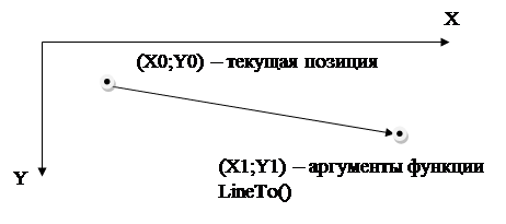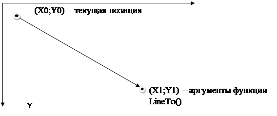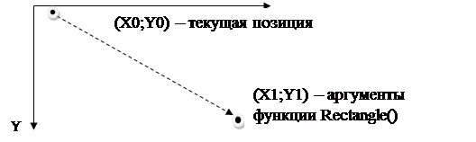 Рисование отрезков прямых производится при помощи функции Rectangle(), от текущей позиции до точки, координаты которой указаны, как аргументы данной функции. Текущая позиция изменяется и находится теперь там, где закончилась линия.