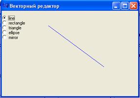 Для рисования отрезков прямых, необходимо активизировать radiobutton «line». Далее необходимо переместить указатель мыши на главную форму. Нажмите левой кнопкой мыши и, не отпуская её, переместите курсор мыши в другую точку окна приложения. Отпустите левую кнопку мыши. На экране отобразится линия (рис.4.1.).