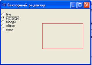 Для рисования прямоугольников, необходимо активизировать radiobutton «rectangle». Далее необходимо переместить указатель мыши на главную форму. Нажмите левой кнопкой мыши и, не отпуская её, переместите курсор мыши в другую точку окна приложения. Отпустите левую кнопку мыши. На экране отобразится прямоугольник (рис.4.2.).