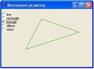 Для рисования треугольников, необходимо активизировать radiobutton «triangle». Далее необходимо переместить указатель мыши на главную форму. Щелкните левой кнопкой мыши, переместите курсор мыши в другую точку окна приложения, щелкните снова. На экране отобразится первая грань треугольника. Далее перенесите курсор в точку, где должна находиться третья вершина треугольника, щелкните там, прорисуются оставшиеся две грани. На экране отобразится треугольник (рис.4.3.).