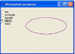 Для рисования эллипсов, необходимо активизировать radiobutton «ellipse». Далее необходимо переместить указатель мыши на главную форму. Нажмите левой кнопкой мыши и, не отпуская её, переместите курсор мыши в другую точку окна приложения. Отпустите левую кнопку мыши. На экране отобразится эллипс (рис.4.4.).