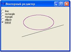 Для рисования эллипсов нельзя использовать функцию Ellipse(), так как в этом случае пропадает возможность его дальнейшего преобразования «зеркалом». Поэтому рисование эллипсов осуществляется «по точкам», пиксели на форме закрашиваются по заданным математическим формулам, образуя эллипс. При этом визуально создание эллипсов выглядит, как и в случае использования функции Ellipse(): мышью отмечаются координаты верхнего левого и нижнего правого угла прямоугольника, в который вписан эллипс.