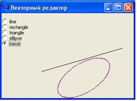 Для преобразования пространства необходимо активизировать radiobutton «mirror». Далее необходимо переместить указатель мыши на главную форму. Нажмите левой кнопкой мыши и, не отпуская её, переместите курсор мыши в другую точку окна приложения. Отпустите левую кнопку мыши. На экране отобразится линия, относительно которой будет происходить преобразование(рис.4.5.), и произойдет само преобразование (все эллипсы зеркально отобразятся относительно линии) (рис.4.6.).