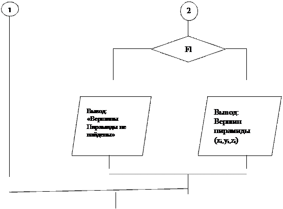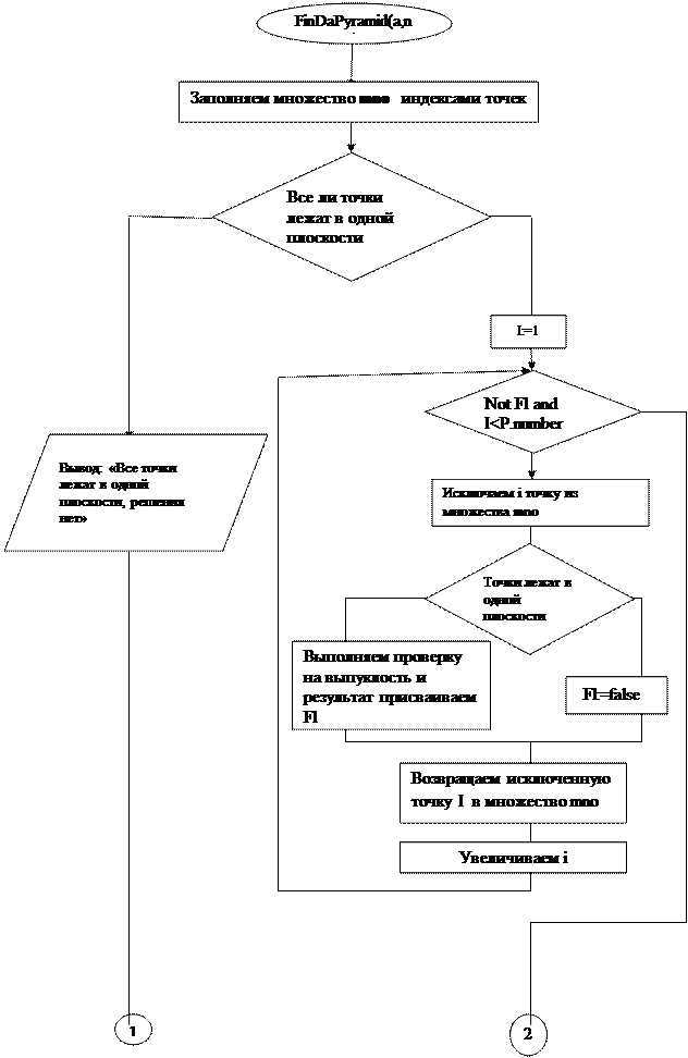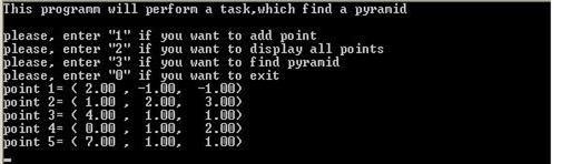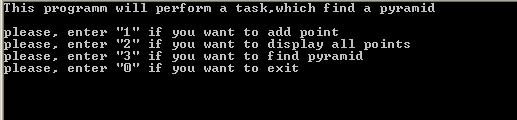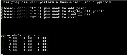 Пункт2.Программа проверяет, лежат ли все данные точки в одной плоскости, если лежат-то решения нет, вершины пирамиды не будут найдены, а на дисплей выведется сообщение «точки лежат в одной плоскости».(переход к пункту 6)