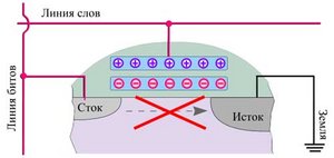 | Наличие заряда на "плавающем" затворе меняет вольт-амперные характеристики транзистора таким образом, что при обычном для чтения напряжении канал не появляется, и тока между истоком и стоком не возникает. |