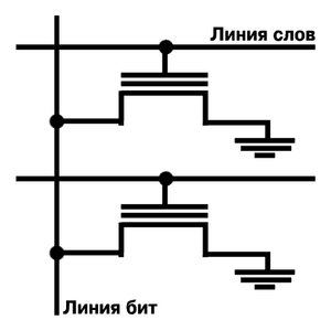 - память только для чтения. Русский эквивалент - ПЗУ (Постоянно Запоминающее Устройство). Если быть совсем точным, данный вид памяти называется Mask-ROM (Масочные ПЗУ). Память устроена в виде адресуемого массива ячеек (матрицы), каждая ячейка которого может кодировать единицу информации. Данные на ROM записывались во время производства путём нанесения по маске (отсюда и название) алюминиевых соединительных дорожек литографическим способом. Наличие или отсутствие в соответствующем месте такой дорожки кодировало "0" или "1". Mask-ROM отличается сложностью модификации содержимого (только путем изготовления новых микросхем), а также длительностью производственного цикла (4-8 недель). Поэтому, а также в связи с тем, что современное программное обеспечение зачастую имеет много недоработок и часто требует обновления, данный тип памяти не получил широкого распространения.