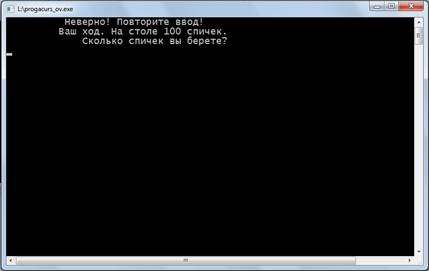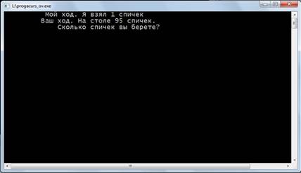Игра продолжается пока пользователь или компьютер не заберут последнюю спичку после чего выводится сообщение о результате игры.