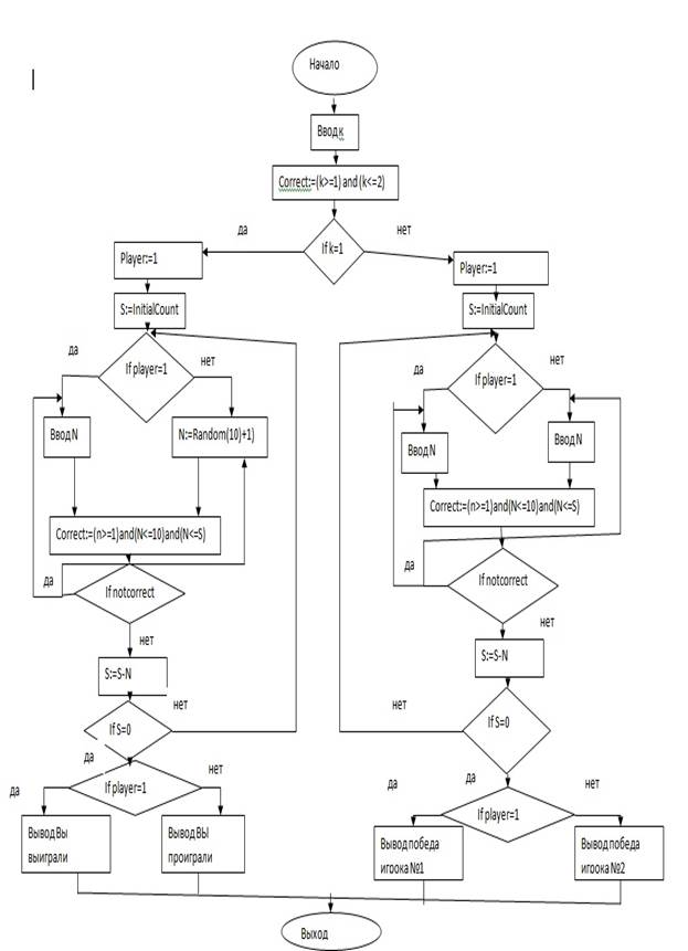 В начале программы пользователю предоставляется возможность путем ввода значения переменной k выбрать, с кем он будет играть (при k=1, при k=2 , иначе повторяется ввод запроса на выбор значения k). После этого переменной S (общее кол-во спичек требуемых для игры) присваивается значение «100». Затем пользователь путем ввода значений переменной N выбирает, какое кол-во спичек он хочет взять. Происходит проверка значения переменной N на соответствие условию (при N>=1, при N<=10 иначе повторяется ввод запроса на выбор значения N). Если значение переменной N соответствует заданным условиям, тогда значение переменной S уменьшается на значение переменной N. Если пользователь в начале игры выбрал значение k=1, тогда после его хода осуществляется ход компьютера, значение переменной задается следующим образом N:=Random(10)+1. В случае, когда после хода пользователя значение переменной S<=10, тогда переменной S присваивается значение «0». Пользователь и компьютер будут ходить поочередно, пока значения переменной S не достигнет нуля. После этого происходит вывод результата на экран.