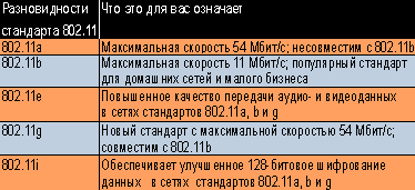 Беспроводные соединения еще только разогреваются на старте. Успех стандарта 802.11b в 2002 г. может оказаться всего лишь прелюдией к молниеносной атаке во второй половине 2003 г., когда дебютируют продукты на основе трех новых разновидностей стандарта 802.11. Прошедшим летом появились первые продукты, поддерживающие стандарт 802.11a, обеспечивающий максимальную скорость передачи данных 54 Мбит/с (теоретический максимум для 802.11b равен 11 Мбит/с). Будьте готовы к тому, что в 2003 г. последуют еще три «беспроводных буковки»: -e, -g и -i (см. таблицу «Разновидности стандарта 802.11»). Первый из этих стандартов, 802.11e, дополняет 802.11a и -b (равно как и -g), улучшая качество передачи голоса, видео и других разновидностей медиаданных. Стандарт .11g обеспечивает такую же, как у 802.11a скорость передачи данных в 54 Мбит/с, но при этом еще и совместим с продуктами стандарта -b. Наконец, стандарт -i улучшает сетевую безопасность, используя 128-битовый стандарт Enhanced Security Network («Сеть повышенной безопасности»), основанный на новом алгоритме Advanced Encryption Standard («Продвинутый стандарт шифрования»).