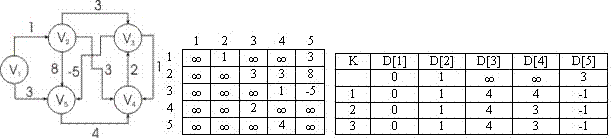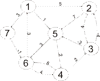 На рисунке 1 приведен: (а) граф; (б) соответствующая ему матрица весов дуг; (в) результаты работы алгоритма Форда-Беллмана.