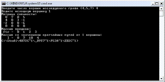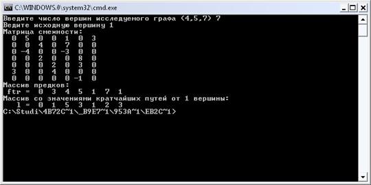 Массив расстояний от 1-ой начальной вершины до остальных: l = (0, 3, 4, 7, 0).