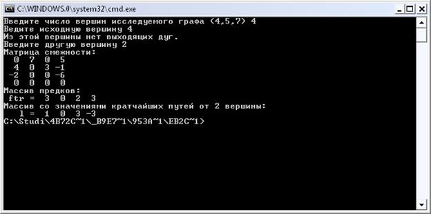 В графе G2 есть вершина, из которой нельзя построить дерево кратчайших путей – это 4 вершина, так как из неё не выходят дуги. Программа проводит проверку на заданную пользователем вершину, в нашем случае 4, и проводит проверку и обнаруживает, что 4 не подходит. Далее программа вновь предлагает ввести номер вершины и для введенной 2 успешно вычисляет выходные массивы. Правильность данных можно проверить, сверив их с деревом кратчайших путей для графа G2 с начальной 2 вершиной на рисунке 13.