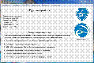 Сама же написанная программа включает в себя набор из нескольких основных операций, которые могут понадобиться при решении более сложных задач, как из теории чисел, так и из других разделов математики.