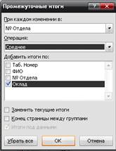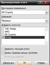 c. Подсчет наименьшего и среднего оклада сотрудников по каждому отделу (используя промежуточные итоги).