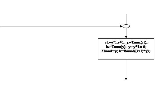 Для реализации алгоритма потребуется написать процедуру, реализующую метод середины квадрата, которую назовем Rand, в которой при первом обращении задается целое число IX из [0.999999] и между вызовами оно не должно меняться. На выходе имеем числа: Rand числа типа Single из (0,1), IX числа типа LongInt из (0,999999), K числа типа LongInt из (0, К+1). Далее зададим переменные. Обнулим 7 и далее разряды числа Х, вычислим квадрат Х. Выберем 4…9 разряды числа Y. Определим новое целое случайное число IX из [0.999999] и случайную величину из [0.1]. Вычислим число К из [0.K+1].