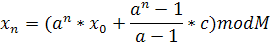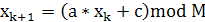 где a > 0, c > 0, M > 0 — некоторые целочисленные константы. Получаемая последовательность зависит от выбора стартового числа X0 и при разных его значениях получаются различные последовательности случайных чисел. В то же время, многие свойства последовательности Xj определяются выбором коэффициентов в формуле и не зависят от выбора стартового числа. Ясно, что последовательность чисел, генерируемая таким алгоритмом, периодична с периодом, не превышающим m. При этом длина периода равна m тогда и только тогда, когда: