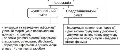 На рис. 1.1 подані дві сторони визначення поняття інформації: функціональна й представницька. Перша загалом визначає коло дій над інформацією, а друга – результат виконання цих дій.