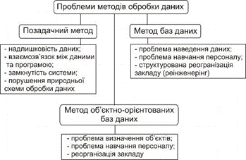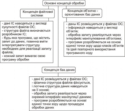 Формування концепції БД (БД) і створення на її основі методу баз даних для вирішення завдань обробки інформації відбулося у 1962 році. До середини 60-х років минулого століття основною концепцією побудови програмного забезпечення була концепція файлової системи й так званий позадачний метод. Наприкінці 80-х років минулого століття була запропонована концепція об’єктно-орієнтованих баз даних й об’єктноорієнтований підхід розроблення програм на основі обробки подій. На рис. 1.3 наведені основні риси для кожної з зазначених вище концепцій. На рис. 1.4 проведене зіставлення основних методів обробки даних.