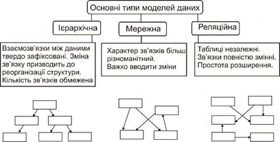 У цей час для баз структурованих даних розрізняють три основних типи логічних моделей даних залежно від характеру підтримуваних ними зв'язків між елементами даних мережну, ієрархічну й реляційну. Ознаками класифікації у цих моделях є: ступінь твердості (фіксації) зв'язку, математичне подання структури моделі й припустимих типів даних (див. таблицю 1.1).
