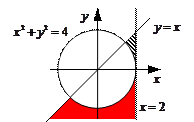 , в который входит заштрихованная область. Таким образом, выполнение всех трех условия означает «вне круга и в секторе». Однако, этому условию удовлетворяет не только заштрихованная область, но еще и вся бесконечная область, выделенная на рисунке красным цветом. Поэтому для любой точки в «красной зоне», например, для точки (1; –2), программа выдаст неправильный ответ «принадлежит».