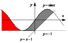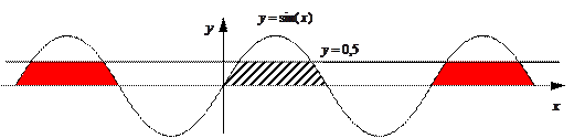 , в который входит заштрихованная область. Однако, этому условию удовлетворяет не только заштрихованная область, но еще и вся бесконечная область, выделенная на рисунке красным цветом. Первое пересечение синусоиды с осью абсцисс происходит при