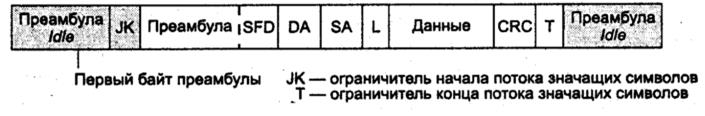 Для отделения кадра Ethernet от символов Idle используется комбинация символов Start Delimiter — пара символов J (11000) и К (10001) кода 4В/5В, а после завершения кадра перед первым символом Idle вставляется символ Т (рис. 1.3).