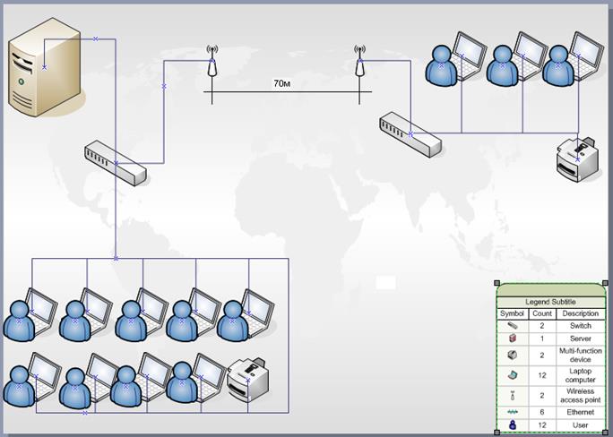 В целях построения локальной сети с общим количеством рабочих станций (ПК) около 10-15, выберем вариант с использованием простейшей топологии, разрешающей длину сегмента не более 200 метров (70 метров в нашем случае), а именно - использование сетевых концентраторов. Также возможно применение дорогостоящего серверного оборудования, но, в целях экономии средств, а также удовлетворения потребностей пользователей, вместо сервера используем одну рабочую станцию в качестве файлового сервера.