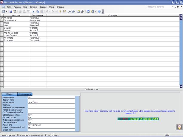 Для этой таблице будет необходимо: Во-первых, № рейса, который мы будем использовать как ключевое поле, во-вторых, время вылета, место вылети и место посадки, в-третьих, будем вводить бортовой номер самолета ( для связи этой таблицы с таблицей самолет), а также создадим 7 полей с названиями ПН,ВТ…ВС в которых будем указывать по каким дням недели будет выполняться этот рейс.