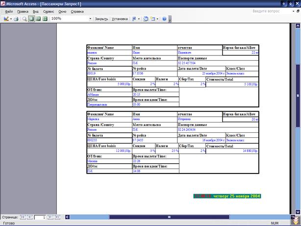- 1 отчет, который используется для печати билета (Пример отчета «Пассажиры Запрос1» указан в Приложении №4)