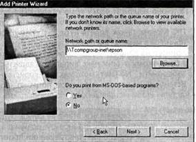 У наступному вікні (мал. 1) в полі Network path or queue name (Сетевой путь или имя очереди принтера) потрібно вказати шлях до даного ресурсу за правилами UNS . Якщо повне ім'я принтера або комп'ютера в мережі не відомі, то можна скористатися командною кнопкою Browse (Обзор). При цьому з'явиться окреме вікно, в якому буду відображено список ПК в мережі, які мають дозволені для спільного використання принтера. Потрібно відкрити папку комп'ютера і вибрати піктограму принтера, а тоді натиснути командну кнопку ОК . У вікні, зображеному на малюнку 1 потрібно також підтвердити – Yes (Да) або заборонити No (Нет) можливість використання даного мережевого принтера для друку з DOS-програм. Встановивши потрібні параметри, потрібно натиснути командну кнопку Next (Далее);
