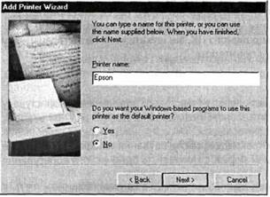 · Наступне вікно (мал.2) містить поле Printer name (Имя принтера), в якому потрібно вказати ім'я мережевого принтера, яке використовуватиметься лише даним ПК. Потрібно також вказати чи використовуватиметься цей мережевий принтер для прикладних програм, як принтер за замовчуванням – кнопка Yes (Да) . Після цього потрібно натиснути кнопку Next (Далее) ;