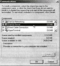 Для цього потрібно ввійти в панель керування (кнопка Пуск ) – пункт Настройки – команда Панель управления і в ній активізувати піктограму Установка и удаление. У вікні, що відкриється, вибрати закладку Установка Windows. В цій закладці вибрати пункт Связь і командну кнопку Состав. При цьому відкривається вікно Связь, що зображене на малюнку 5. Необхідно переконатись, що опція Сервер удаленного доступа відмічена.