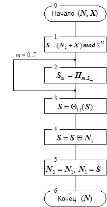 Шаг 0. Определяет исходные данные для основного шага криптопреобразования: N –преобразуемый 64-битовый блок данных, в ходе выполнения шага его младшая (N1 ) и старшая (N2 ) части обрабатываются как отдельные 32-битовые целые числа без знака. Таким образом, можно записать N=(N1 ,N2 ). X – 32-битовый элемент ключа;