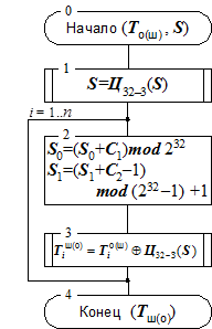 Шаг 0. Определяет исходные данные для основного шага криптопреобразования: Tо(ш) – массив открытых (зашифрованных) данных произвольного размера, подвергаемый процедуре зашифрования (расшифрования), по ходу процедуры массив подвергается преобразованию порциями по 64 бита; S – синхропосылка, 64-битный элемент данных, необходимый для инициализации генератора гаммы;