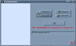 Основная форма TestForm, содержит список файлов и кнопки запуска процесса шифрования, выхода, вызова окна настроек, добавления и очистки списка (рисунок 4.1).