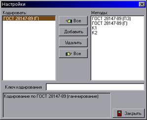 - ГОСТ 28147-89 - стандарт шифрования Российской Федерации. В программе используется два режима кодирования – режим простой замены и режим гаммирования. Данные кодируются по 64 бита (8 байт) с помощью 256-битного (32-байтного) ключа.