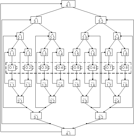 3. Между уровнями системы происходит обмен информацией, при этом приоритетом обладает информация, поступающая с верхнего уровня. Для нижнего уровня она является командной и подлежит выполнению, если это возможно;